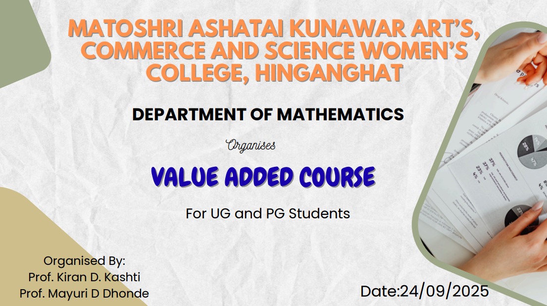 The Value added course Program by Department of Mathematics organized by Matoshri Ashatai Kunawar Women’s College, Hinganghat was held on full report