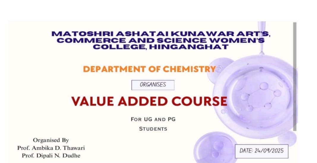 The Value added course Program by Department of Chemistry organized by Matoshri Ashatai Kunawar Women’s College, Hinganghat was held on full report
