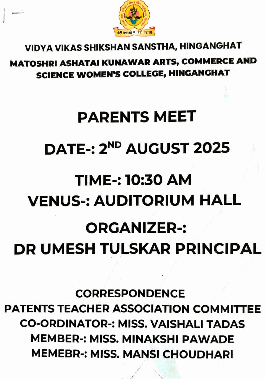 On 02nd August 2025, A parent meeting was organized by Parents Teacher Association Committee at Matoshri Ashatai Kunavar Arts, Commerce and Science Women’s College, Hinganghat iffwfwf. The event was presided over by Dr. Umesh Tulskar, Principal of Matoshri Ashatai Kunavar Arts, Commerce and Science Women’s College, while Dr. Nayana Tulskar, Secretary of Vidya Vikas […]
